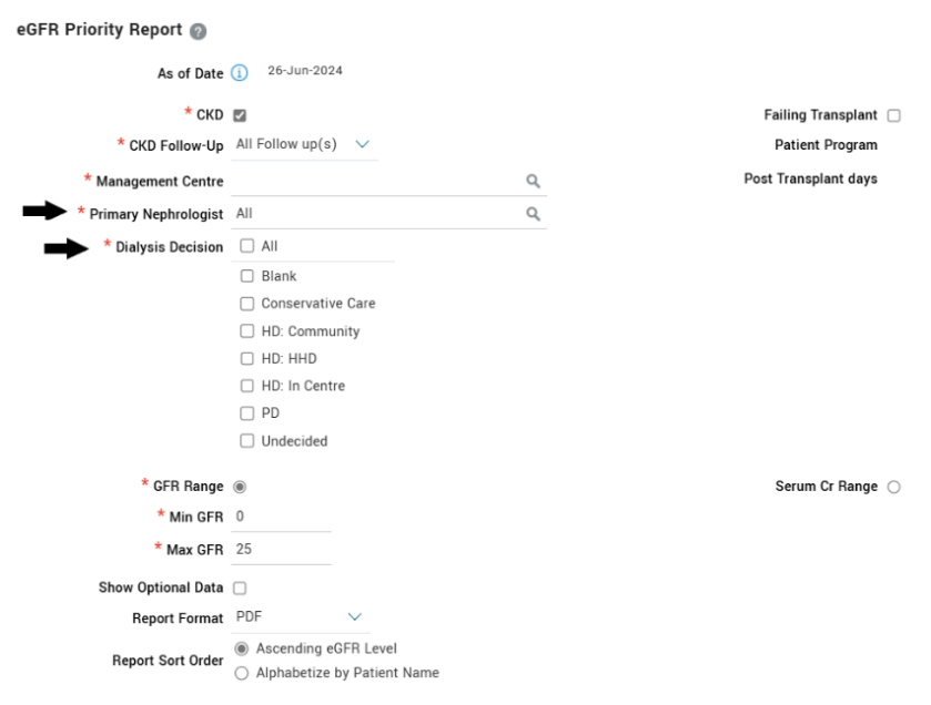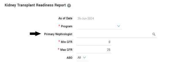 When selecting the parameters to run the report please ensure that a Primary Nephrologist is selected.