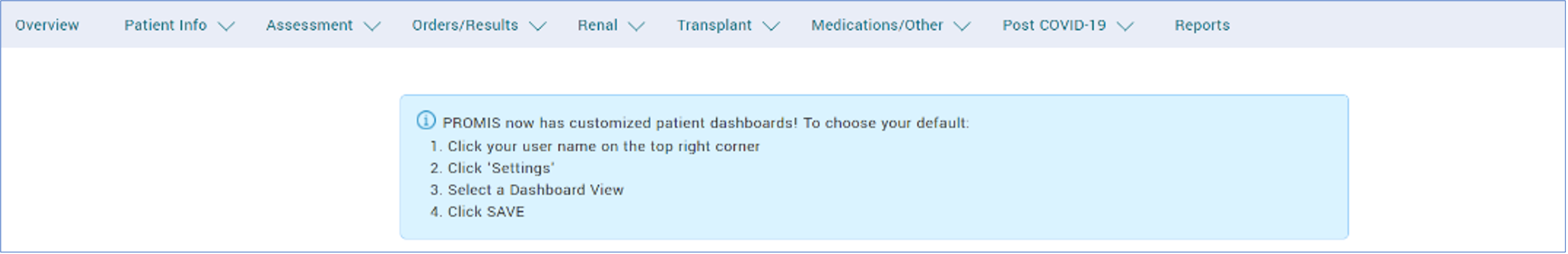 • If a user has no dashboard selected, or has selected “Blank”, an informational message will display in the centre of the Patient Overview screen regarding how to set up customized Dashboards.