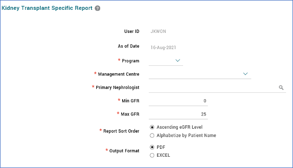 • eGFR Priority report format: The eGFR Priority report can be printed in formatted Excel and unformatted Excel (listed as Excel). If printing a report in an unformatted Excel format, no optional data is available for selection.