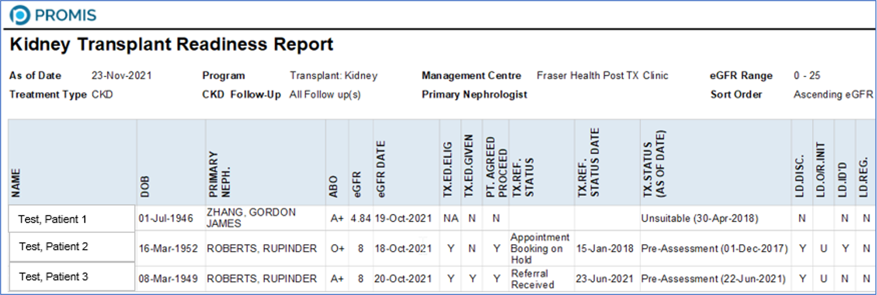 • A Pre-Transplant report provides an easy identification process for patients who are eligible and ready to begin the pre-transplant process. The report provides easy identification of patients who are currently followed up in a centre; the status for the transplant process is one of the columns displayed.