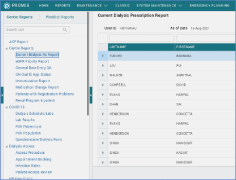 • The Current Dialysis Prescription report allows HD, HHD and PD nurses to retrieve a patient list of all opened and current dialysis prescriptions, for patients and centres to which the User has access.
