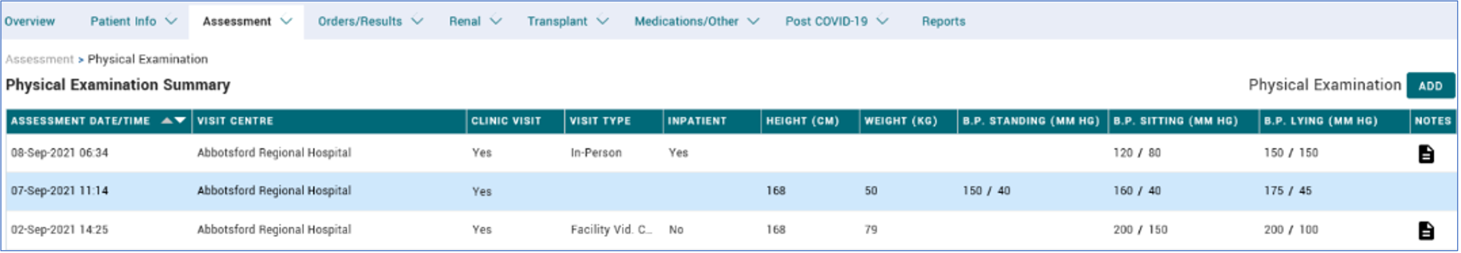 • The Physical Exam screen displays when users click on the related tab while in the Dialysis Access module.