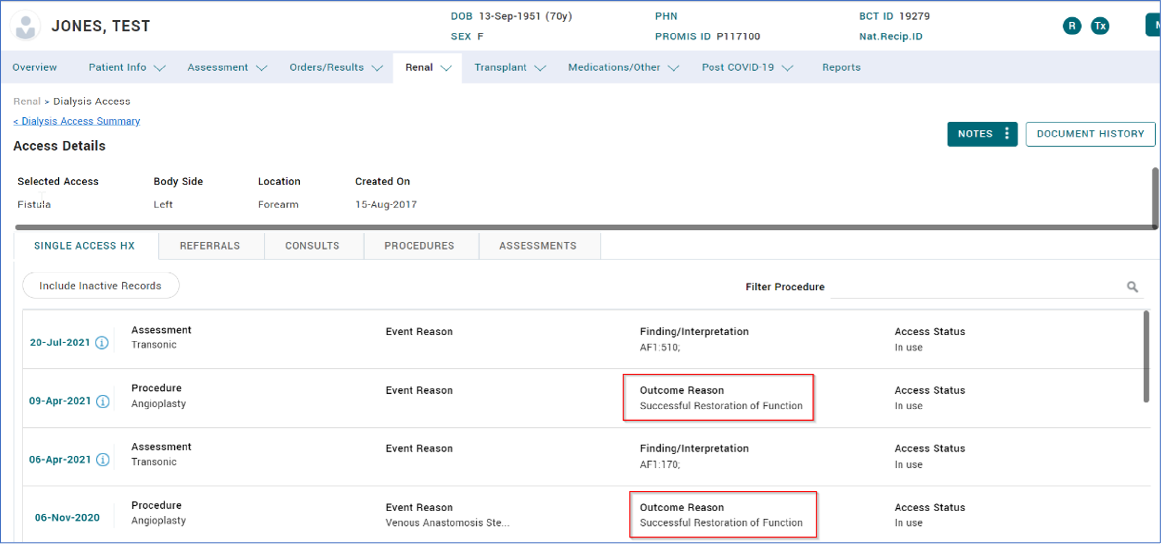 • Single Access Hx: The “Outcome Reason” field from Procedures now displays on the records in the Single Access History tab.