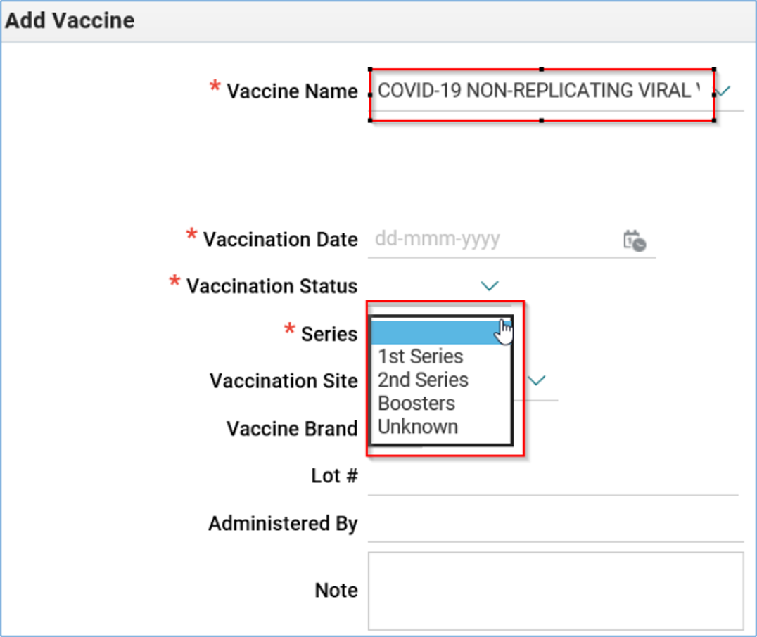 - COVID-19 vaccines series includes 1st Series, 2nd Series, Boosters, Unknown values.