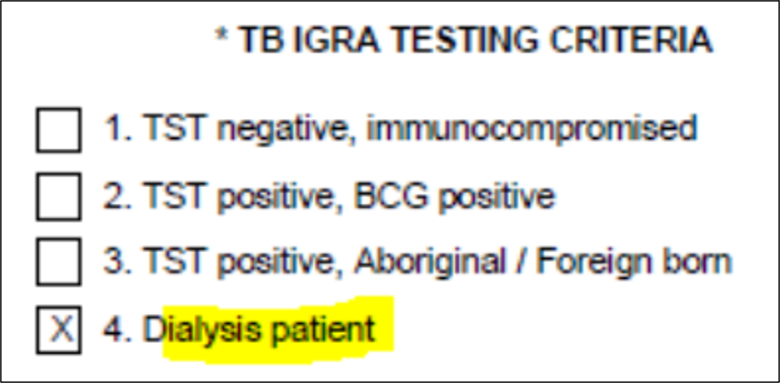 - SUPPORT-15959 TB IGRA Requisition form: label under the TB IGRA Testing Criteria section updated from “Hemodialysis Patient” to “Dialysis Patient”, to include all dialysis treatment modalities.
